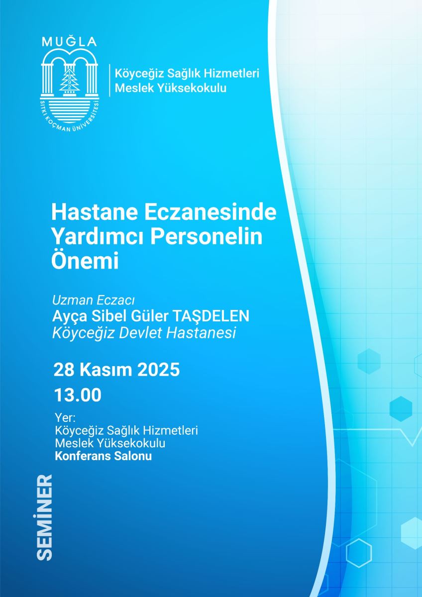 "Hastane Eczanesinde Yardımcı Personelin Önemi" Semineri 28 Kasım 2025 tarihinde saat 13:00'da "Hastane Eczanesinde Yardımcı Personelin Önemi" semineri Köyceğiz Devlet Hastanesi Eczacısı Ecz. Ayça Sibel Güler Taşdelen tarafından Köyceğiz Sağlık Hizmetleri MYO konferans salonunda gerçekleştirilecektir. Son Güncelleme : 25.11.2025 14:18 Okunma Sayısı : 44